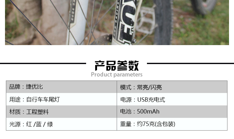 特性:LED技術(shù),COB整面發(fā)光,高亮100流明設(shè)計,實現(xiàn)整體流暢設(shè)計;配備USB接口,可循環(huán)充電;2種模式7種效果可循環(huán)切換;電池自動保護功能,電壓低于2.8V不工作;硅膠捆扎固定方式,120度方位調(diào)整,方便拆卸安裝;方型背扣設(shè)計,可橫向和縱向不同角度安裝;可安裝在坐管,下叉,車把手,前叉等。
