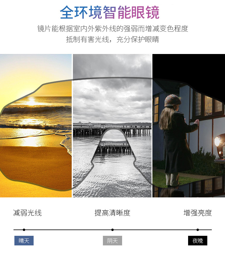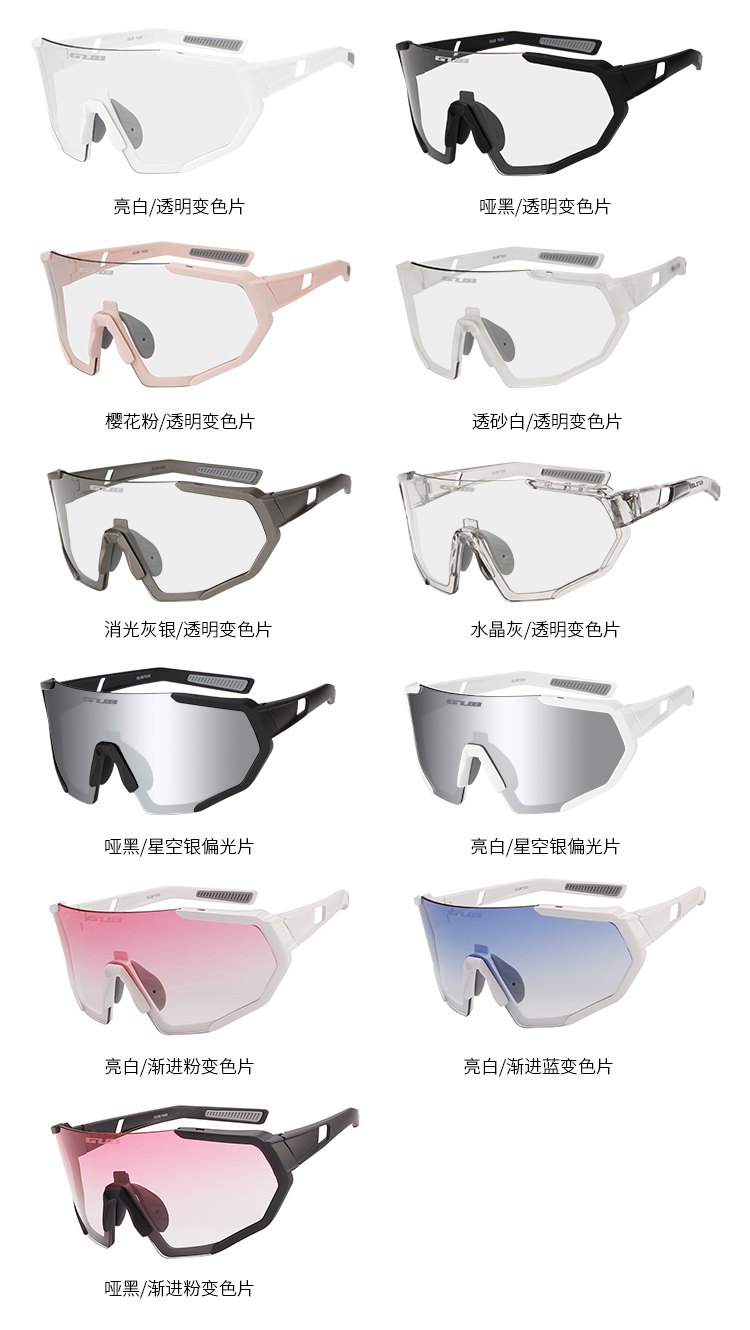 顏色:?jiǎn)『?透明變色片、亮白/透明變色片、櫻花粉/透明變色片、消光灰銀/透明變色片、透砂白/透明變色片、水晶灰/透明變色片、啞黑/星空銀偏光片、亮白/星空銀偏光片、亮白/漸進(jìn)粉變色片、亮白/漸進(jìn)藍(lán)變色片、啞黑/漸進(jìn)粉變色片
