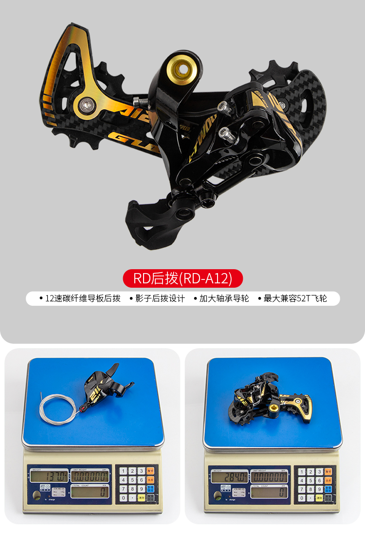 后撥:12速碳纖維導(dǎo)板后撥,影子后撥設(shè)計,加大軸承導(dǎo)輪,最大兼容52T飛輪